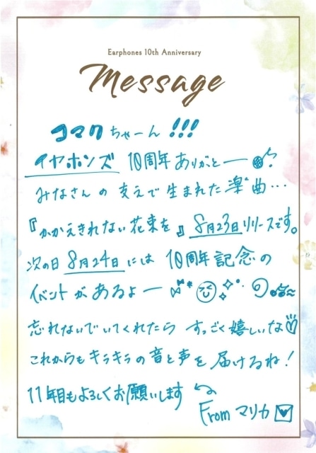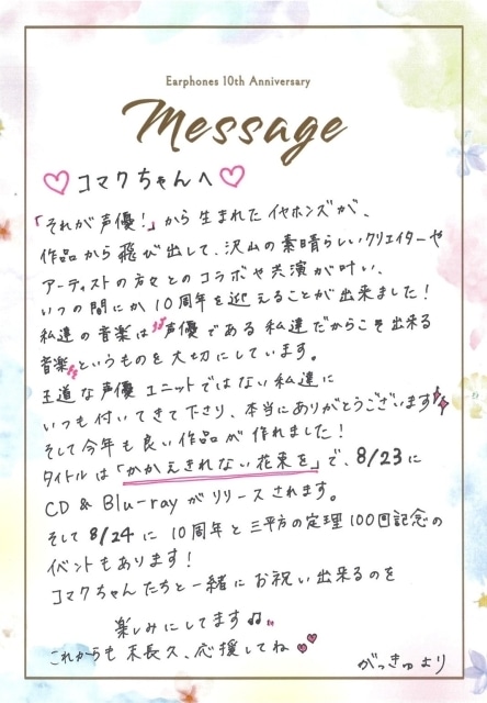 本日7月23日(水)の「手紙の日」にちなみ、イヤホンズを支えてくれているすべてのファン(=通称コマクちゃん)に向けて、メンバー直筆のメッセージが公開された。