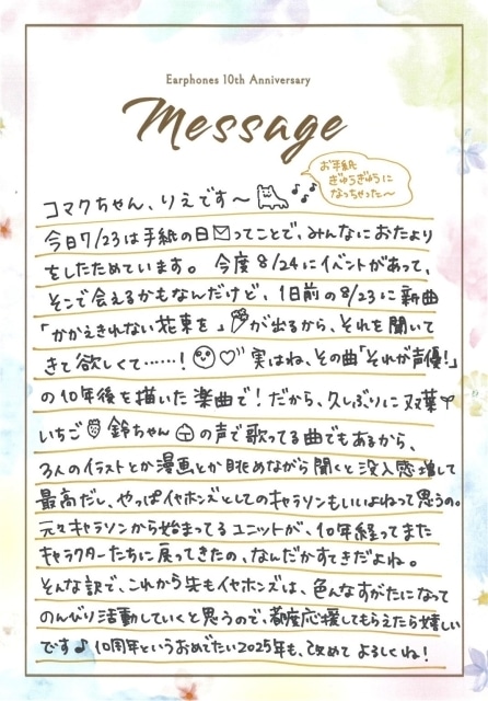 今回公開されたのは、メンバーが“手紙”という形でそれぞれ綴った、デビュー10周年を迎えられたことへの感謝の想いが込められたものとなっている。10年間イヤホンズとともに歩んできたコマクちゃんへ贈る、特別な手紙となっているので、ぜひイヤホンズ公式ホームページ・公式Xからチェックしてほしい。