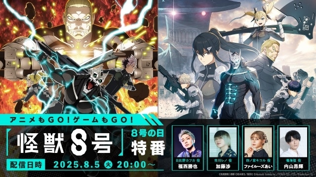 また、8月5日の“8号の日”に特番配信が決定。福西勝也さん(日比野カフカ/怪獣8号役)、加藤 渉さん(市川レノ役)、ファイルーズあいさん(四ノ宮キコル役)、内山昂輝さん(鳴海 弦役)が出演します。