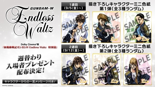 Dolby Cinema®版『新機動戦記ガンダムW Endless Waltz 特別篇』の週替わり入場者プレゼントとして「描き下ろしキャラクターミニ色紙」を配布予定です。 色紙には、あさぎ桜さん描き下ろしの新規イラストを使用し、各キャラクターの一言メッセージ付きとなっています!