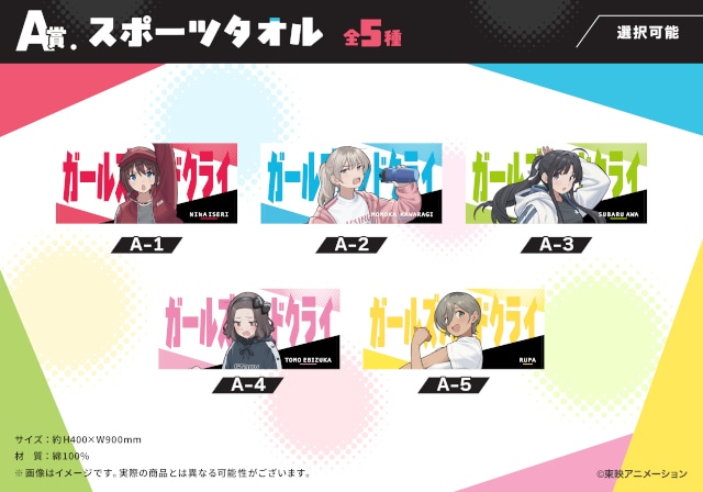 S賞「等身大タペストリー」とA賞「スポーツタオル」はそれぞれ、井芹仁菜、河原木桃香、安和すばる、海老塚智、ルパの全5種から選択可能! 続くB・C・D賞も含め、すべてのグッズが「トゲナシトゲアリ」メンバーの絵柄になっています。