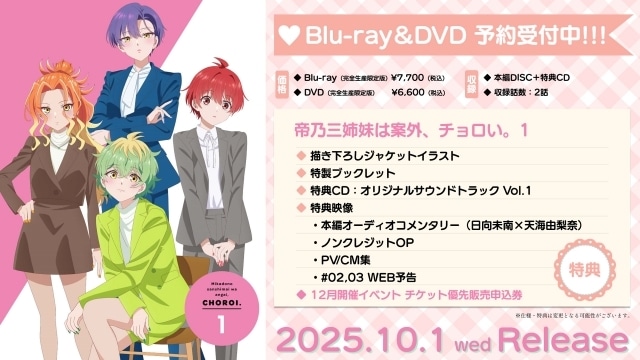 さらに、Blu-ray&DVD第1巻のジャケットデザイン、ミニアルバム「帝乃三姉妹と優の、キャラソン。」の全収録曲も解禁されています。