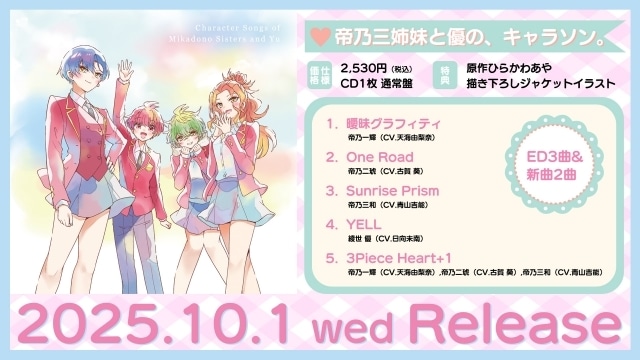 10月1日(水)リリースとなるミニアルバム「帝乃三姉妹と優の、キャラソン。」の全収録曲を解禁いたしました!三姉妹のエンディング楽曲に加え、綾世優のソロ曲と三姉妹曲も収録決定!