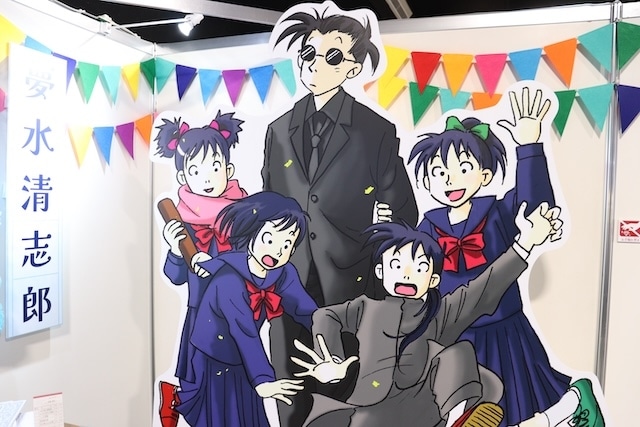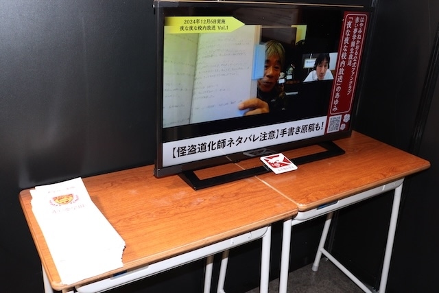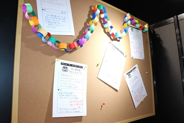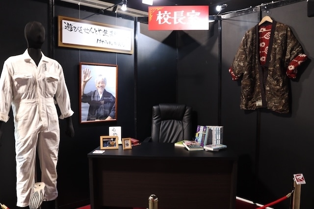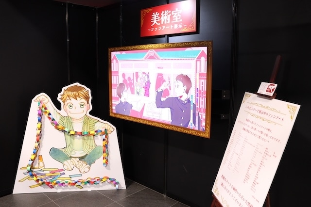 赤い夢学園には「校長室」「生徒会室」(「美術室」含む)「1年10組」「2年5組」のエリアが展開されており、スタンディパネルやイラスト、資料の数々が大迫力で展示されていました。