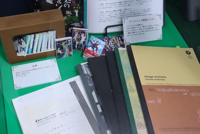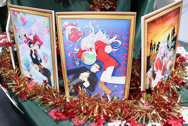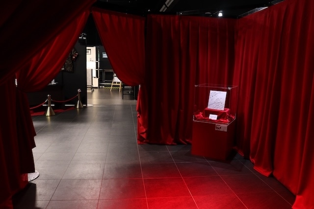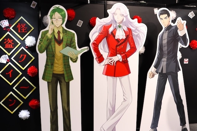 スタンディパネルやイラスト、ストーリー創作ノート、キャラクターの初期デザイン画などファン必見の展示物の数々。カジノを模したイラストの立体展示の周りにはトランプが散りばめられていたりもして、エリア内の装飾からも『怪盗クイーン』の世界を色濃く感じられることでしょう。