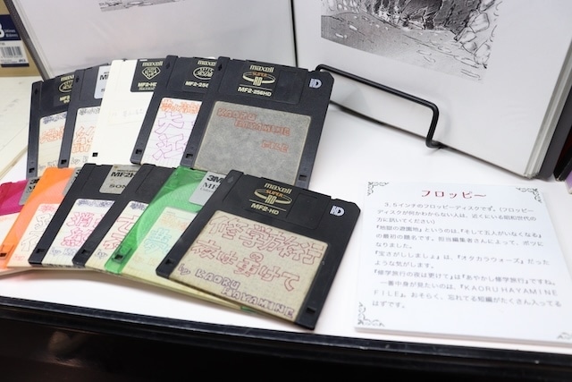 黒板を見た瞬間、本当の学校の教室を訪れたような気分に。こちらでもストーリー創作ノートやフロッピーなどが公開されているので解説コメントも含め、じっくりとお楽しみください!