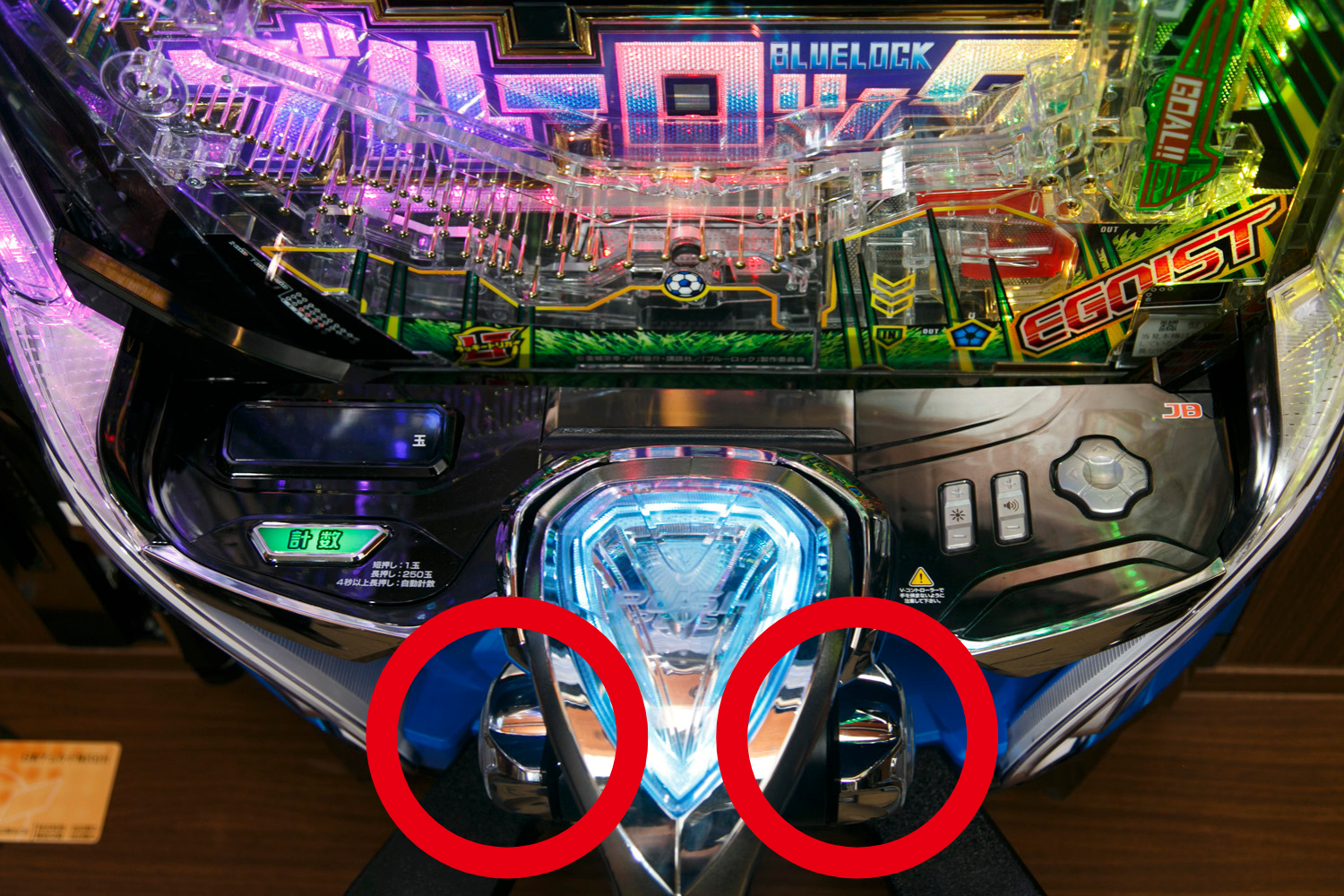 お金を入れて、貸出ボタンを押したら準備が完了。ではここから早速『eフィーバーブルーロック』を試遊していきます。筐体の下に大きく光るレバーとハンドルがあるので、左右どちらかのハンドルをやんわりと奥に捻ると、玉がどんどん出てきて感動……!