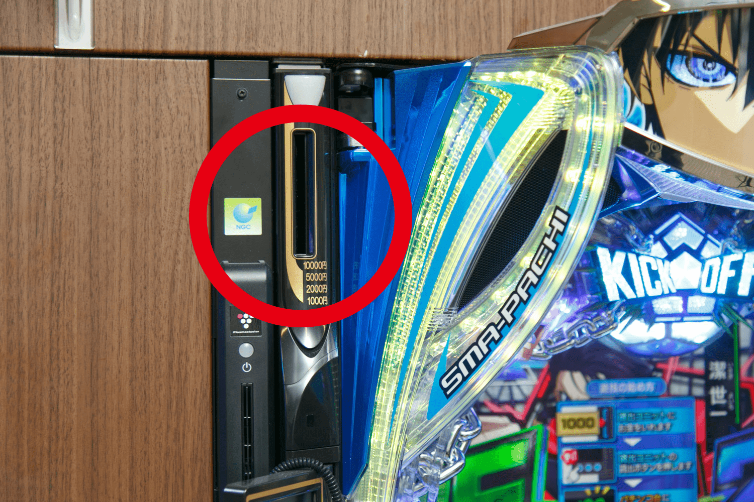 まずは初めに、左上に設置されている紙幣投入口にお札を入れると、その下にあるパネルに残金や「貸出ボタン」が表示されます。(今回は試遊機のためパネルはオフなっていましたが、実際には点灯するそうです)。