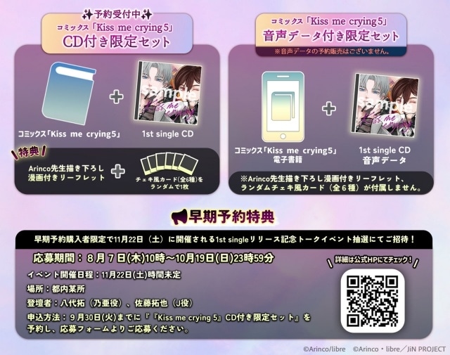 本日より、「JiN」1st singleが付属したコミックス『Kiss me crying 5』CD付き限定セットの発売予約が、ノイタミナショップ(店舗・通販)と全国のアニメイト(店舗・通販)にてスタート。音声データ付き限定セットは、11日10日(月)よりアニメイトブックストアにて販売される。