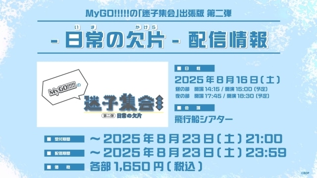8月16日(土)、飛行船シアターにて開催されるMyGO!!!!!の「迷子集会」出張版 第二弾 -日常の欠片-の配信チケットが現在発売中です。