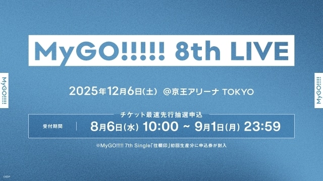 2025年12月6日(土) 京王アリーナ TOKYOにて開催、MyGO!!!!! 8th LIVEのチケット最速先行抽選申込を受付中です。