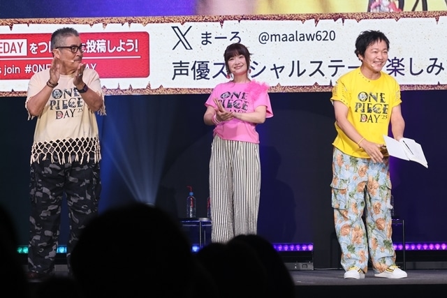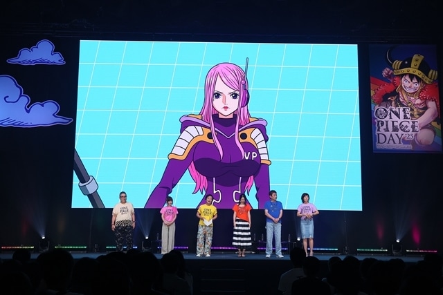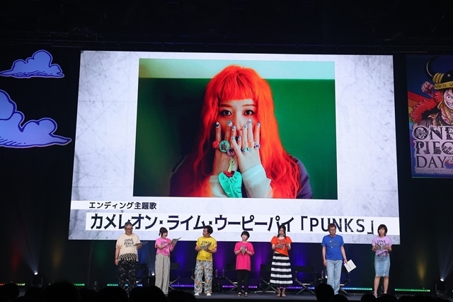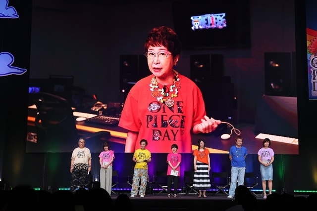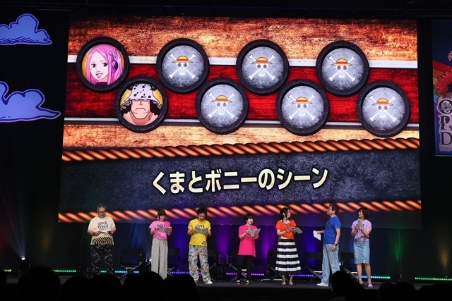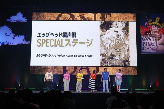 ナミ役の岡村明美さん、ウソップ役の山口勝平さん、サンジ役の平田広明さん、トニートニー・チョッパー役の大谷育江さん、ニコ・ロビン役の山口由里子さん、ジンベエ役の宝亀克寿さん、ジュエリー・ボニー役の高木礼子さんら「エッグヘッド編」キャストが登壇した「エッグヘッド編声優SPECIAL ステージ」。