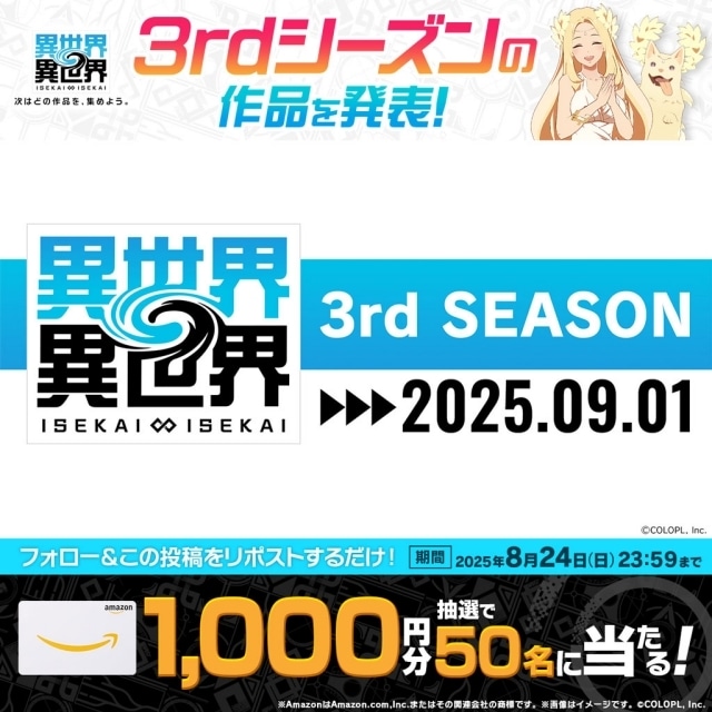 公式Xでは、フォロー&リポストキャンペーンを開催中です。『異世界∞異世界』公式Xをフォローし、対象ポストをリポストした方の中から抽選で50名様に、アマゾンギフトカード(1,000円分)をプレゼントいたします。