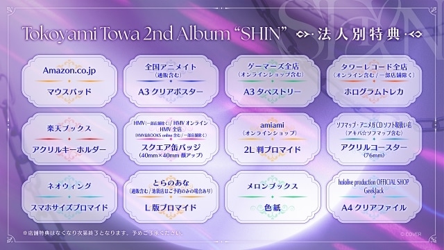 下記販売店にて『SHIN』通常盤をお買い上げのお客様に先着で法人別オリジナル特典を差し上げます。