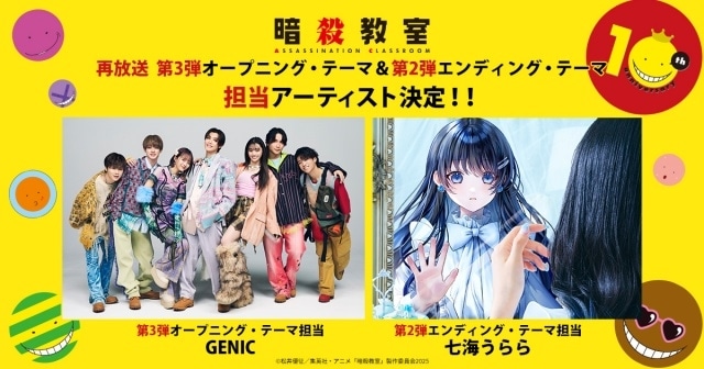 この度、現在放送中のTVアニメ「暗殺教室」再放送の第3弾オープニング・テーマがGENICの「ENDER」、第2弾エンディング・テーマが七海うららの「Infinity karat」に決定。同楽曲は2025年10月より再放送の第2期第1話の放送回より使用され、放送開始に合わせ両楽曲の配信もスタートする。