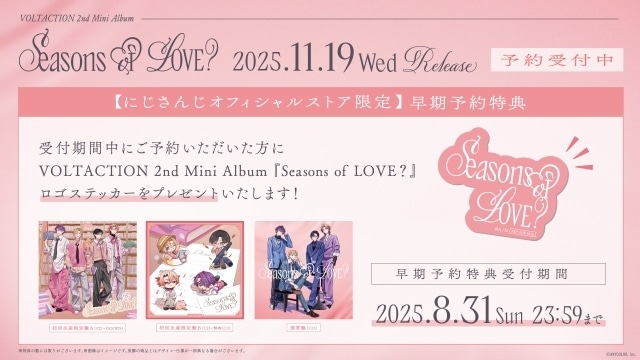 VOLTACTION 2nd Mini Album『Seasons of LOVE?』発売を記念して、にじさんじオフィシャルストアにてご予約いただいた方に早期予約特典として「Seasons of LOVE?ロゴステッカー」をプレゼントいたします。