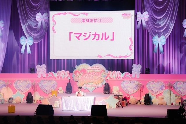 「OGC魔法学園」に続いては、待望のライブコーナー。幕間映像「唯ちゃんが30の質問に答えます」を挟み、先に獲得した変身呪文を観客が叫ぶことで、魔法少女をイメージしたライブ衣装にチェンジした小倉がステージに。