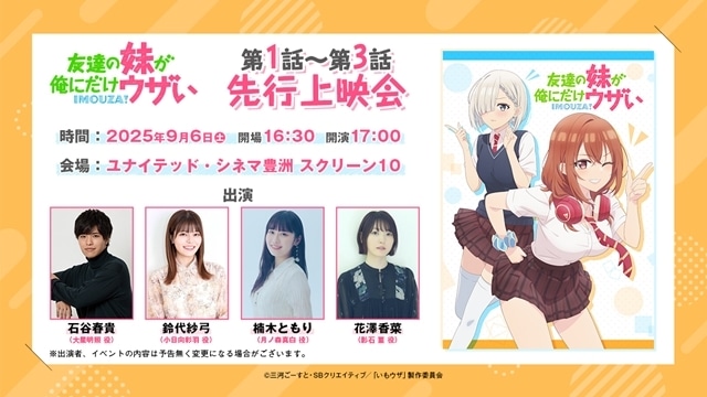 『友達の妹が俺にだけウザい』第1話〜第3話先行上映会が開催決定! 石谷春貴さん・鈴代紗弓さん・楠木ともりさん・花澤香菜さんが登壇