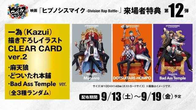 ヒプノシスマイクのキャラクターデザインを手掛ける一為(Kazui)(ヨミ:カズイ)が新たに描き下ろしたイラストが使用された、来場者特典第11弾の「一為(Kazui)描き下ろしイラストCLEAR CARD ver.2 [Buster Bros!!!/MAD TRIGGER CREW/Fling Posse ver.](全3種ランダム)」の配布期間は9月2日(火)~9月12日(金)まで、第12弾の「一為(Kazui)描き下ろしイラストCLEAR CARD ver.2 [麻天狼/どついたれ本舗/Bad Ass Temple ver.](全3種ランダム)」の配布期間は9月13日(土)~9月19日(金)までとなっている。