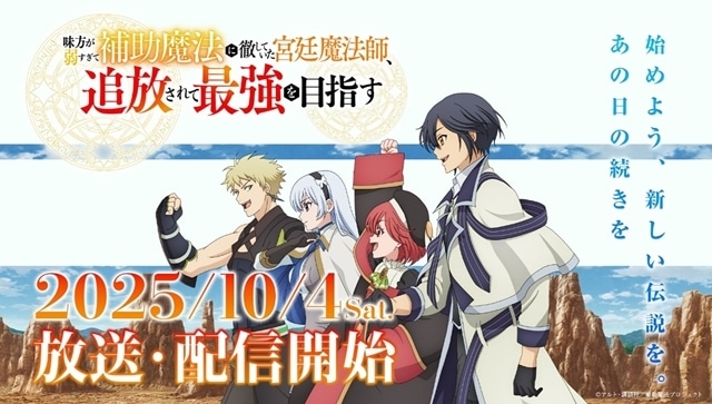 TVアニメ『味方が弱すぎて補助魔法に徹していた宮廷魔法師、追放されて最強を目指す』初回放送日が、2025年10月4日(土)に決定! テレビ朝日系全国24 局ネット“IMAnimation”枠・BS朝日・AT-Xにて順次放送、ABEMA・U-NEXT・アニメ放題にて独占配信を開始します。
