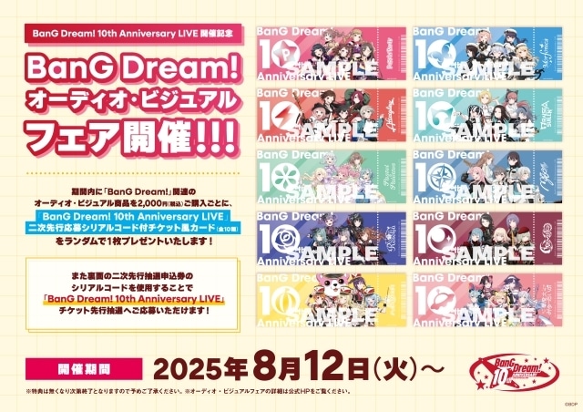 ※「BanG Dream! 10th Anniversary LIVE開催記念 BanG Dream!オーディオ・ビジュアルフェア」開催対象店舗にて「BanG Dream!」関連のオーディオ・ビジュアル商品を2,000円(税込)ご購入毎に、「『BanG Dream! 10th Anniversary LIVE』二次先行応募シリアルコード付チケット風カード」を1枚お渡し。