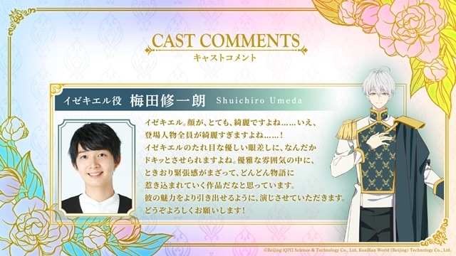 優雅な雰囲気の中に、ときおり緊張感がまざって、どんどん物語に惹き込まれていく作品だなと思っています。彼の魅力をより引き出せるように、演じさせていただきます。どうぞよろしくお願いします!