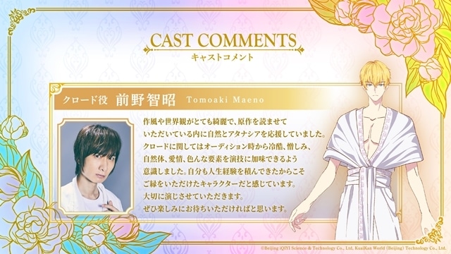 クロードのCVを担当させていただきます前野智昭です。作風や世界観がとても綺麗で、原作を読ませていただいている内に自然とアタナシアを応援していました。