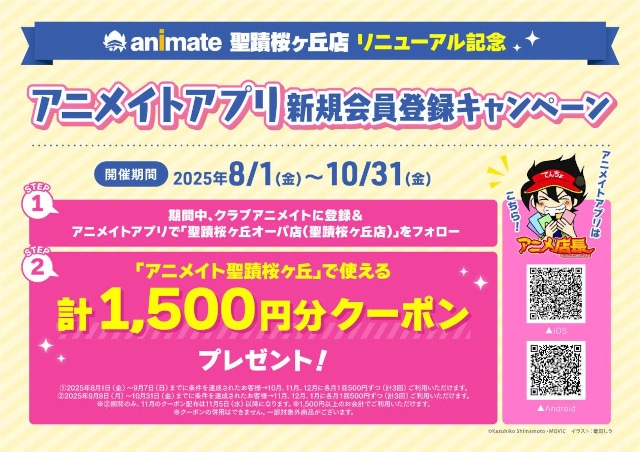 開催内容:期間中にクラブアニメイトへの登録と、アニメイトアプリで「アニメイト聖蹟桜ヶ丘」をフォローいただいたお客様に、「アニメイト聖蹟桜ヶ丘」で使える計1,500円分のクーポンをプレゼントいたします。