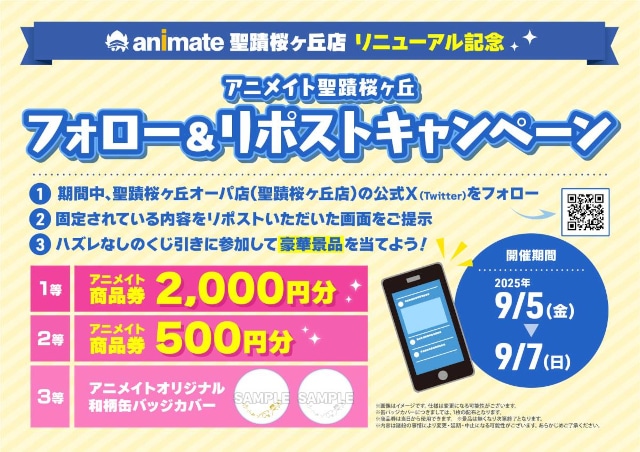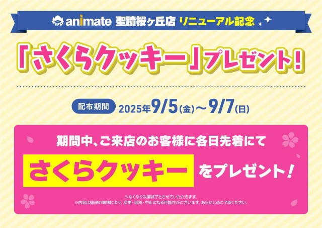 さらに、今回のリニューアルオープンを記念して、9月5日~9月7日の期間中、絶賛放送中のTVアニメ『カラオケ行こ!』と『夢中さ、きみに。』のオリジナルステッカーや、「さくらクッキー」のプレゼントを行います。その他にも、アニメイト福袋の販売やハズレなしのくじ引きなど、さまざまな施策をご用意しています。