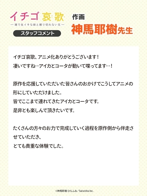 生イキ義妹とカタブツ義兄のハチャメチャラブコメ『イチゴ哀歌~雑で生イキな妹と割り切れない兄~』(原作:ひらふみ/作画:神馬耶樹)がTVアニメ化決定!