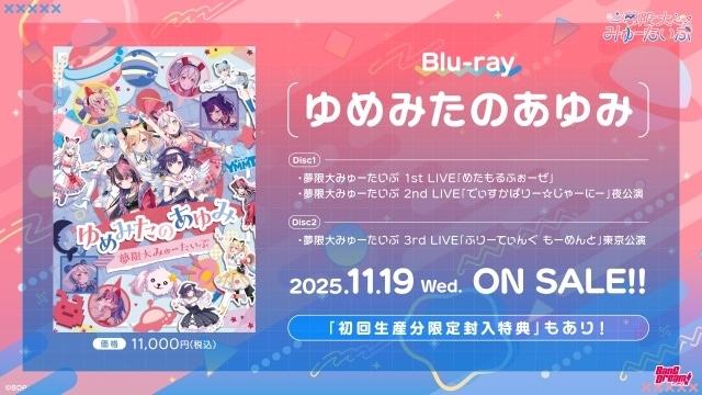 2025年11月19日(水)に、夢限大みゅーたいぷ Blu-ray「ゆめみたのあゆみ」の発売が決定しました。1st LIVEから3rd LIVEまでのライブ映像が収録されます。また、初回生産分には、夢限大みゅーたいぷ 47都道府県制覇の旅「スーパーポジション 〜スピンアップ編〜」愛知・京都・新潟・広島・大阪・宮城・福岡公演の最速先行抽選申込券(4公演申込可)が封入となります。