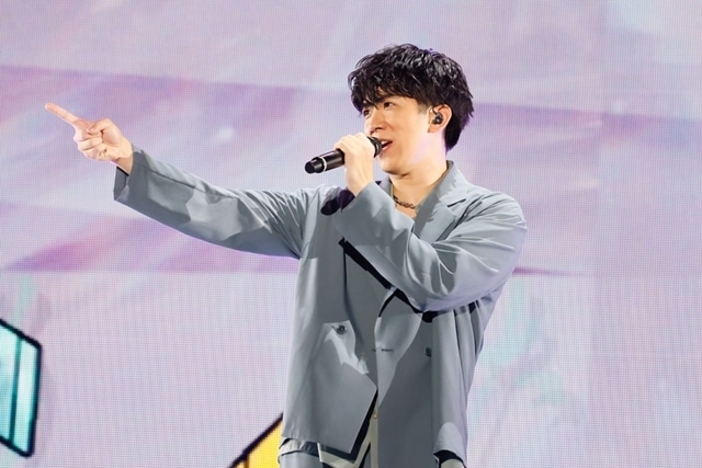 Fling Posseの黄色、麻天狼のグレーという、それぞれのテーマカラーのレーザーが交差し、開幕を告げた今回のライブ。ステージにはFling Posseの3人(飴村 乱数を演じる白井悠介、夢野 幻太郎を演じる斉藤壮馬、有栖川 帝統を演じる野津山幸宏)と、麻天狼の3人(神宮寺 寂雷を演じる速水奨、伊弉冉 一二三を演じる木島隆一、観音坂 独歩を演じる伊東健人)が一挙に登場。観客からは大きな歓声が上がる。