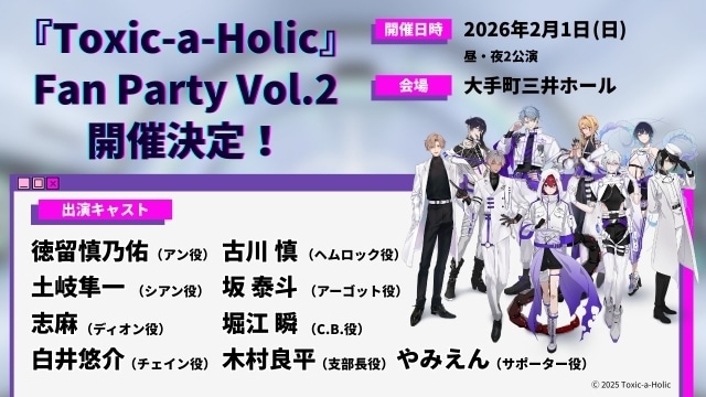 2026年2月1日にプロジェクト2回目となるリアルイベント「『Toxic-a-Holic』Fan Party Vol.2」を開催が決定いたしました。本イベントは『Toxic-a-Holic』に出演する声優陣によるトークイベントです。