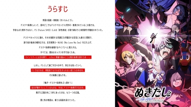 誇り高き童貞にして処女厨であった淳之介はこの条例に疑問を持ち、自身と愛する妹の純潔を守るべく、反交尾勢力・NLNS(No Love No Sex)を立ち上げ、ドスケベ条例の破壊を目指して動き始める――!
