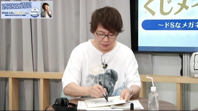 まずA賞は置鮎との「1対1のオンラインお茶会」。約5分の対話時間が設けられ、終了後には記念撮影も行われます。「何を話しても良い」と置鮎が話すと、「預金残高とかも?」と冗談混じりに尋ねる諏訪部。視聴者からも「預金残高気になる」「斬新w」といった反応が寄せられていました。B賞は置鮎のサイン入り色紙。配信中にリアルタイムで作成される様子が映されました。