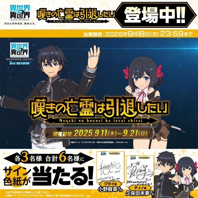 本日2025年9月11日(木)より「3rdシーズン」第2弾として、人気アニメ作品「嘆きの亡霊は引退したい」とキャラクターが本作に登場しております。