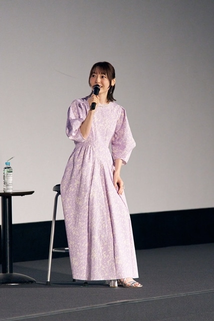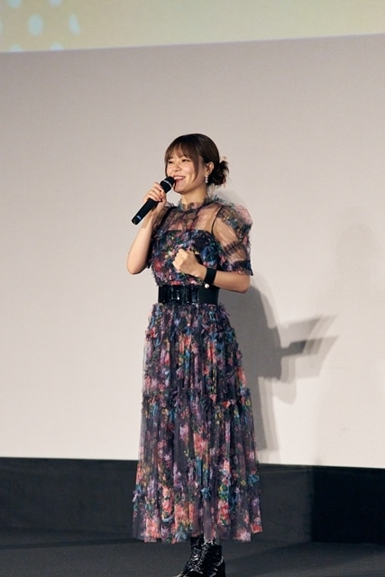 上映終了直後の熱気が冷めやらぬ中、拍手に迎えられて登壇した石谷さん、鈴代さん、楠木さん、花澤さん。「本日はご来場ありがとうございます」と元気よく挨拶をした石谷さんがMC役となり、まずは順番に挨拶をしていきます。