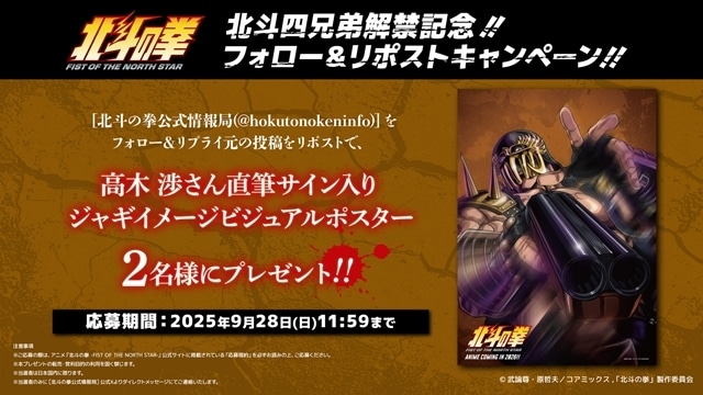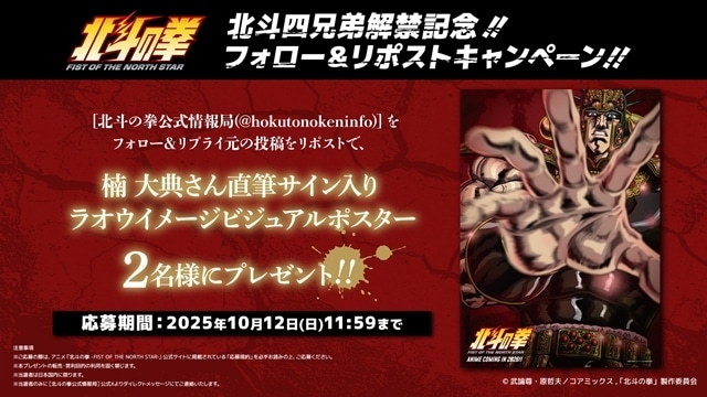 アニメ『北斗の拳 -FIST OF THE NORTH STAR-』の北斗四兄弟キャスト解禁を記念して、キャスト直筆サイン入りグッズが当たるXキャンペーン(下記①~⑤)を9月13日(土)~10月12日(日)にわたって全5回実施します。
