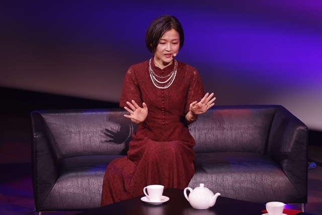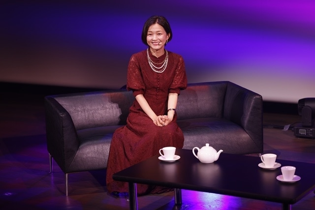 ミステリアスな雰囲気漂うステージに登場したのは、四葉真夜役の斎藤千和。本イベントで解禁される新情報が描かれた4枚の<招待状>をMCと共に明かしていく。