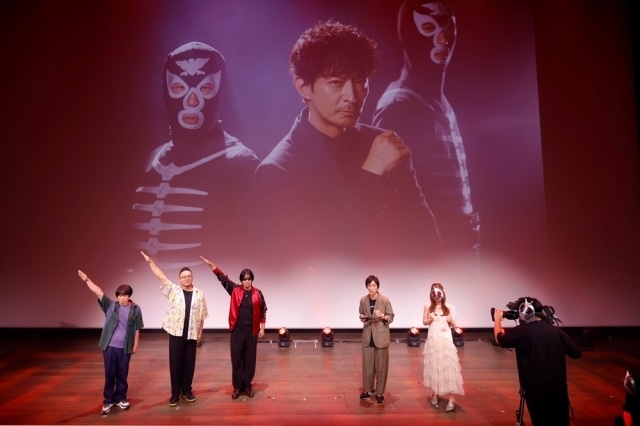 続けて津田さんからの紹介で、初公開となる最新PVもお披露目に。映像公開後のスタジオではMCの天城サリーさんや撮影スタッフも、思わず仮面ライダーのお面を被ってしまうほど大興奮!そんな中、落合さんが天城さんのお面を奪おうとすると、主人公・東島丹三郎のセリフが会場内に鳴り響きます。