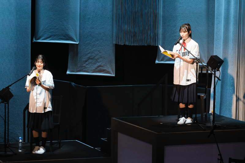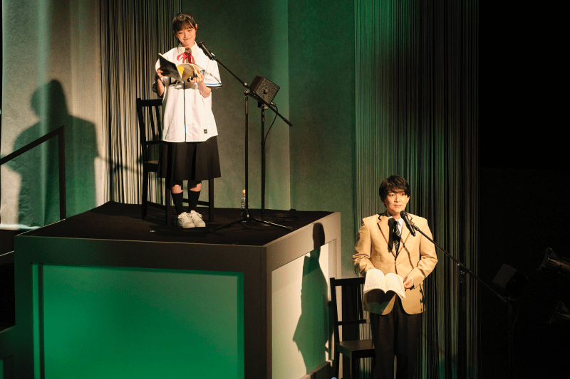 その物語が、朗読劇というかたちでステージに立ち上がる。しかも、人気実力派声優たちによる日替わりキャスト制という、毎公演ごとに異なる表情を楽しめる贅沢な構成。本日上演した回では、成瀬あり役を岩田陽葵が、島崎みゆき役を紡木吏佐が、西浦航一郎役を梅田修一朗が担当した。