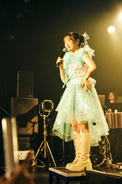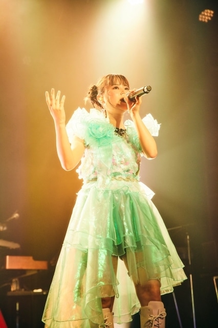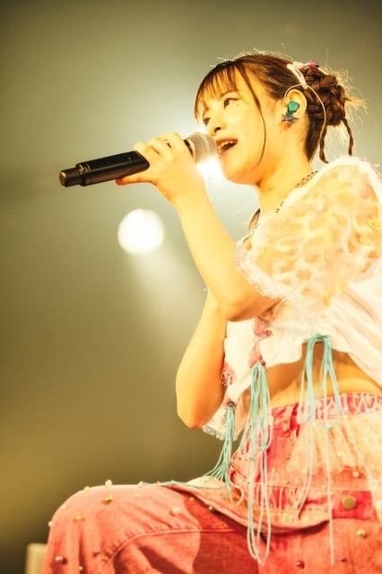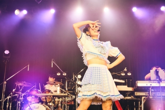 この日最初のMCではまず、場内を包む熱気に「すごいねー!」と満足気な表情をみせる前田。「声優になってからライブハウスでライブをするのは初めて!」ということで、ファンの近くでライブをできる嬉しさもあらわにする。また同時に、オールスタンディングとなったフロアに向かって「めいっぱい踊って飛び跳ねて、楽しんでください!」とのメッセージも送っていた。