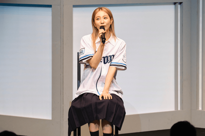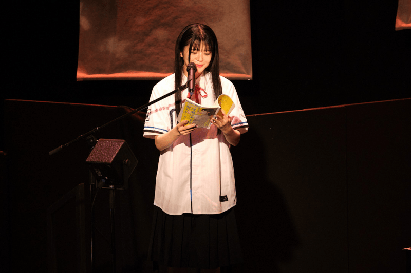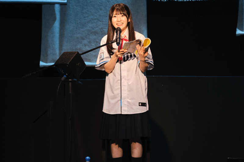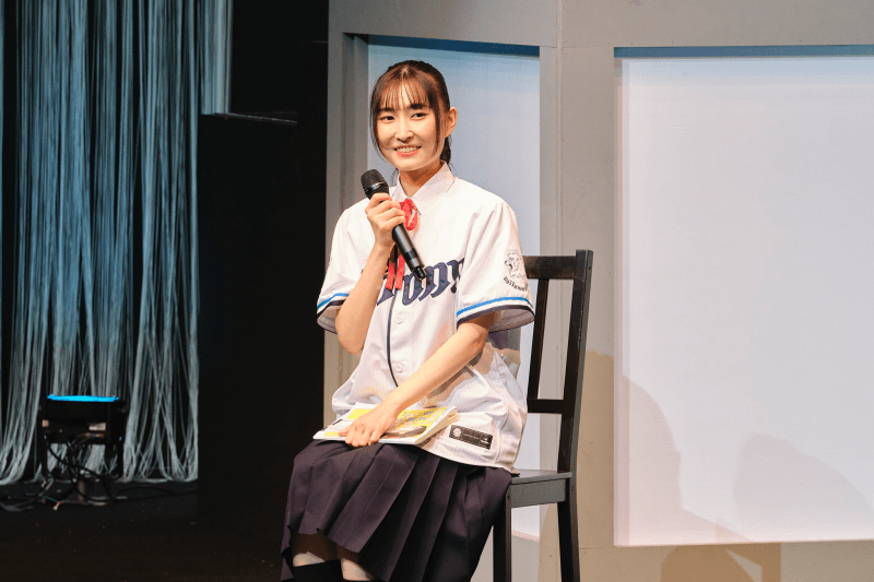 安済知佳演じる成瀬は、まっすぐに自分の思いを貫く芯の強さと、他者の言葉に耳を傾ける柔らかさを併せ持つ人物像を、丁寧かつ深みのある演技で立ち上げていました。一つひとつの声に確かな重みが宿っており、成瀬というキャラクターが内に抱く信念が静かに伝わってくるようでした。特に「この夏を西武に捧げようと思う」という印象的な台詞では、その決意がまるで祈りのような静けさを伴って観客の胸に染みわたり、物語の核をそっと照らしていました。 また、朗読劇でありながら全身を使った安済ならではのフィジカルな演技も大きな見どころのひとつでした。感情の高まりに合わせて思わず体が動いてしまうような自然な身振りは、場面にエネルギーを与え、共演者からは「電車が通ったのかと思うほどの存在感だった」と笑い交じりに語られるほど。そうした大胆な動きの中にも繊細な感情の流れが息づいており、舞台に鮮やかな生命力をもたらしていました。