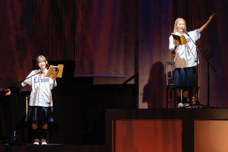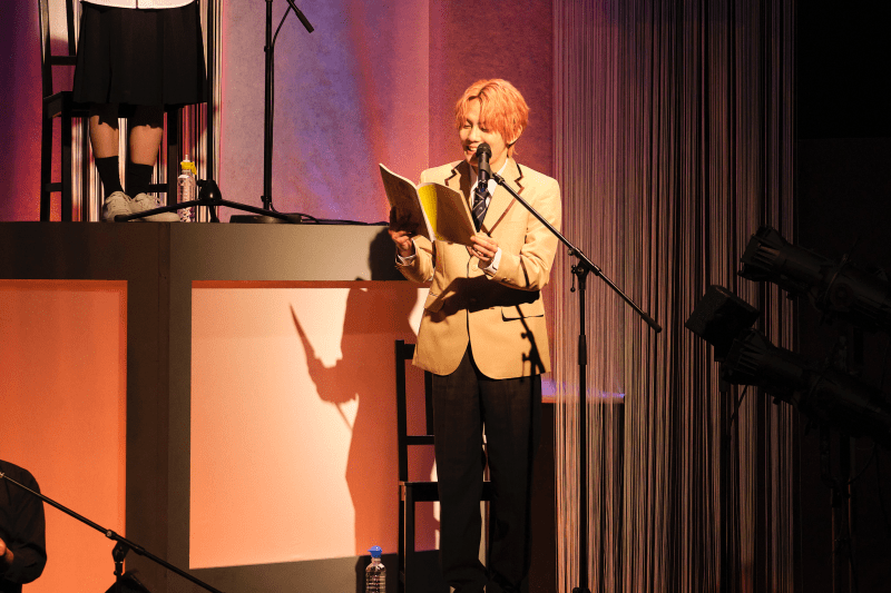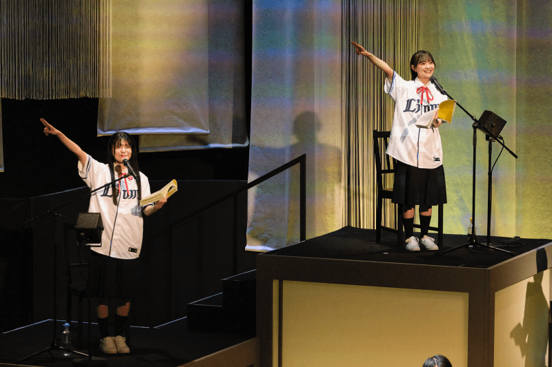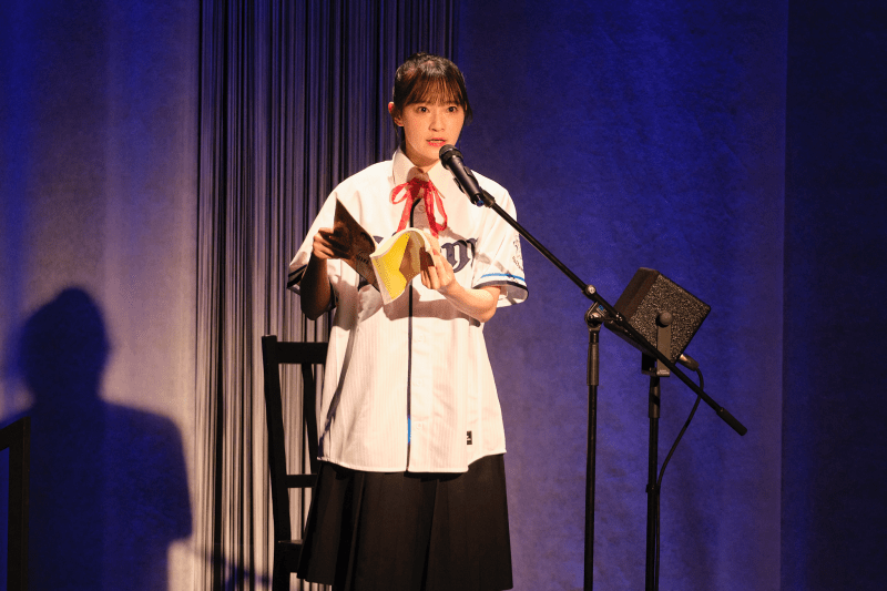 本公演では成瀬が、親友の島崎と組んだお笑いコンビ「ゼゼカラ」の解散宣言をするところから始まります。 原作では終盤に描かれる「解散します!」のエピソードを物語の起点に据え、そこから過去の「成瀬」との印象的なエピソードを各登場人物が回想するというオリジナル構成で朗読劇として実現。セリフの間合いや呼吸の重なり、音楽・照明との繊細な連携によって、〈読む〉体験とは異なる〈聴く〉物語としての魅力が丁寧に紡がれました。小説の持つ鮮烈なキャラクターと、瑞々しい青春の手触りが、朗読劇という表現形式を通してあらたな輪郭を得た三日間となりました。