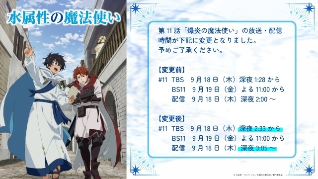 また、第11話の放送・配信時間が一部変更となります。TBSでは9月18日深夜2:33から、BS11では9月19日よる11時から、配信は9月19日深夜3:05~順次開始となります。