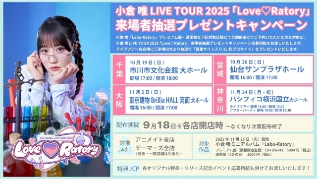 11月25日(火)発売「Labo-Ratory」プレミアム盤・通常盤を下記対象店舗にて全額前金にてご予約いただいた方を対象に、小倉 唯LIVE TOUR 2025 「Love♡Ratory」来場者抽選プレゼントキャンペーンの抽選番号が記載された応募用紙をお渡しいたします。