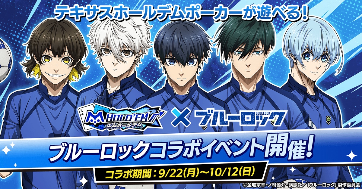 スマホ向けポーカーアプリ「m HOLD’EM」と『ブルーロック』が9月22日からコラボ開始! 人気キャラクター、「潔世一」 、「蜂楽廻」 、「凪誠士郎」 、「糸師凛」、「氷織羊」が登場します!