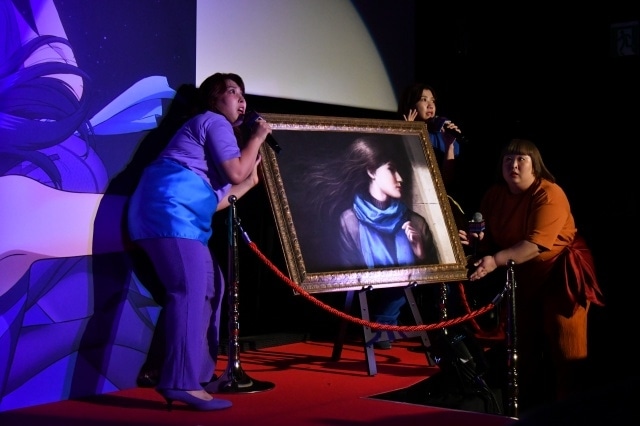 そんな中、「ローマの女をいただきにあがります」というキャッツアイからの予告状がスクリーンに映し出されると、会場は真っ暗に・・・・・・!驚く登壇者たちをよそにステージに現れたのは、3人組の怪盗たち。ステージに置かれた「ローマの女」の絵に手をかけようとしたところでスポットライトが当てられ、その正体はキャッツアイに憧れるスペシャルゲスト、お笑い芸人の3時のヒロインであることが明らかになりました。