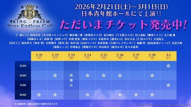 公演は2026年2月21日(土)〜3月1日(日)、日本青年館ホールにて上演となります。チケットは本日9月19日より公式1次およびFCチケット受付がスタートしております。これまで以上にパワーアップした 舞台「KING OF PRISM-Your Endless Call-み~んなきらめけ!キンプリ☆ツアーズ」に、ぜひご期待ください。