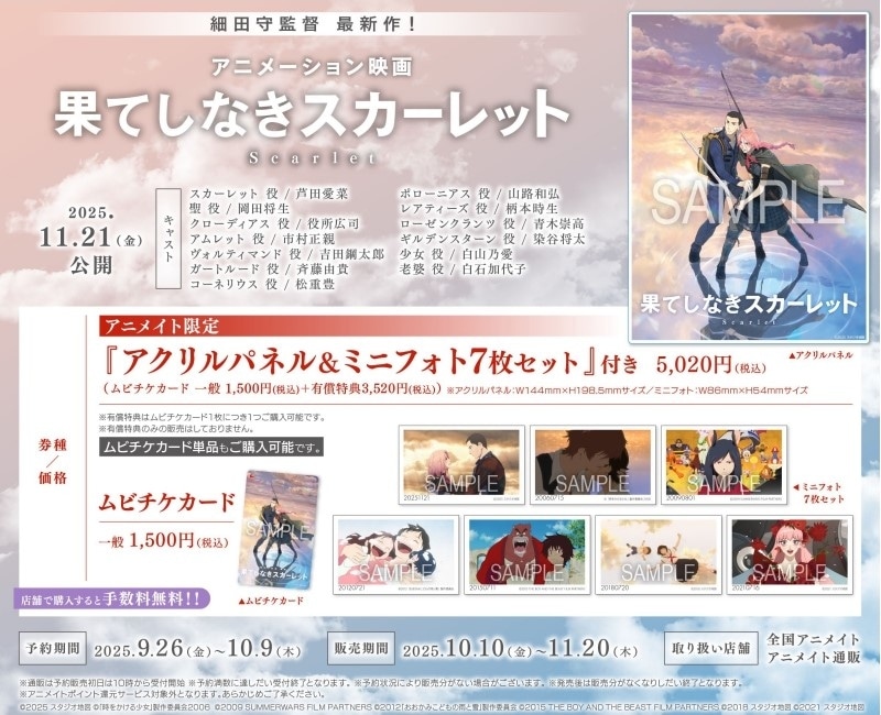 アニメイトでは、ムビチケカードとキービジュアル絵柄のアクリルパネル、さらに「果てしなきスカーレット」のほか、細田監督の歴代の名作「時をかける少女」「サマーウォーズ」「おおかみこどもの雨と雪」「バケモノの子」「未来のミライ」「竜とそばかすの姫」のミニフォト7種がセットになった、アニメイト限定『アクリルパネル&ミニフォト7枚セット』付きムビチケカードの発売が決定!ただいま全国アニメイト・アニメイト通販 で予約受付中です。